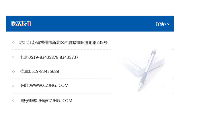 地址:常州市新北區友邦商務大廈1幢16、17層  電話:0519-85101652  傳真:0519-85112595  郵編:213022  網址:www.cz-jiayue_cn.kunruiglwb.com  郵箱:xiajifengaa@163.com
